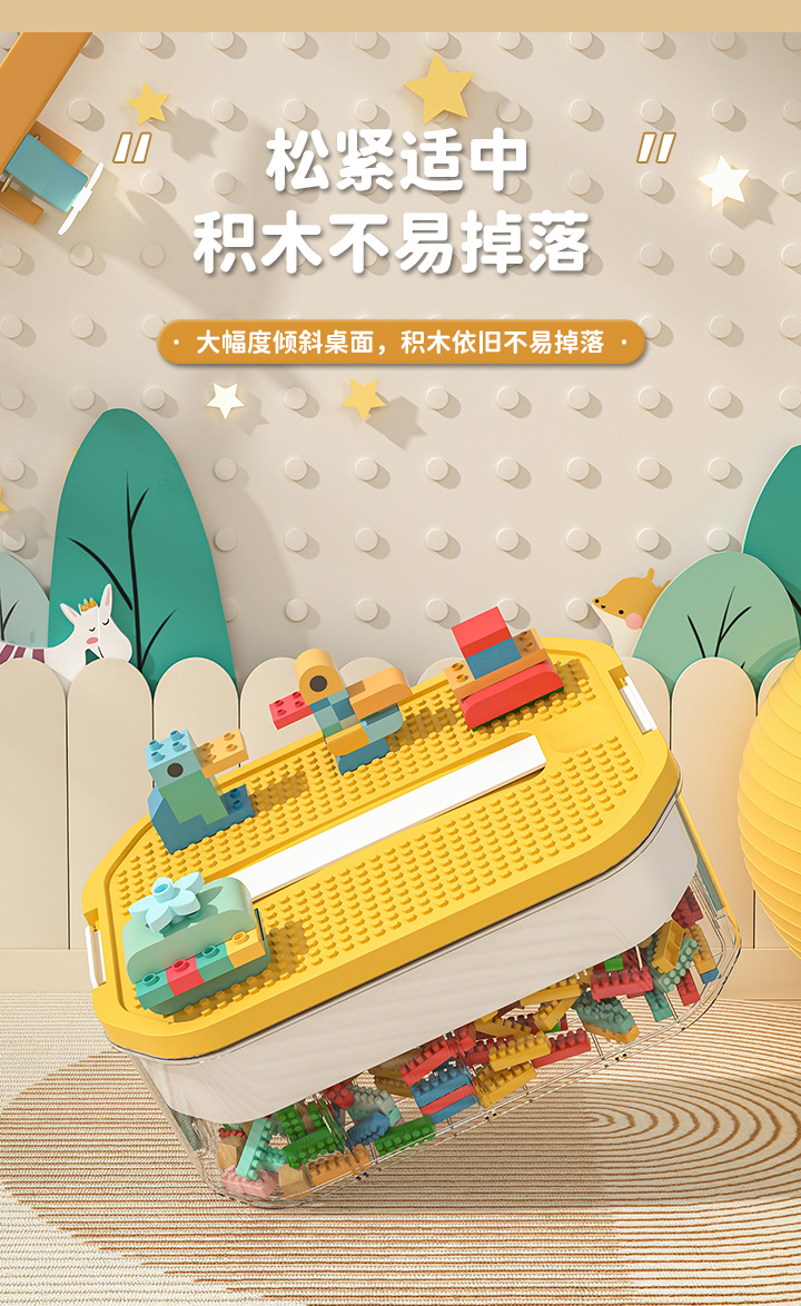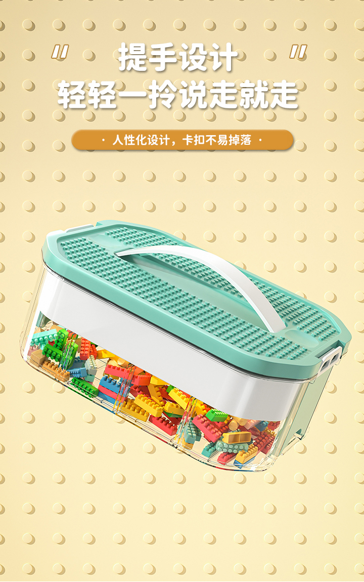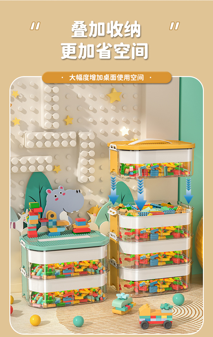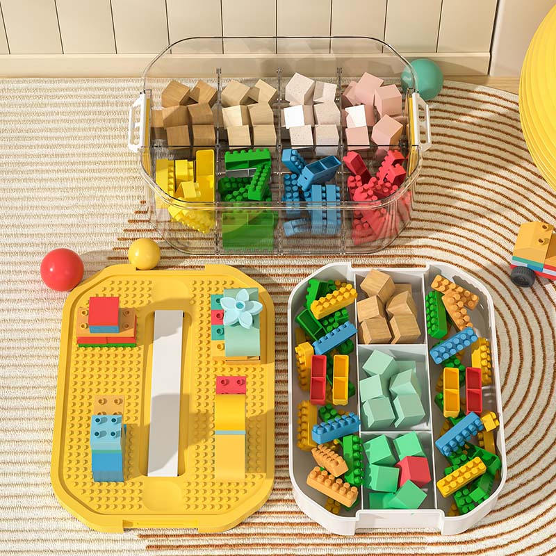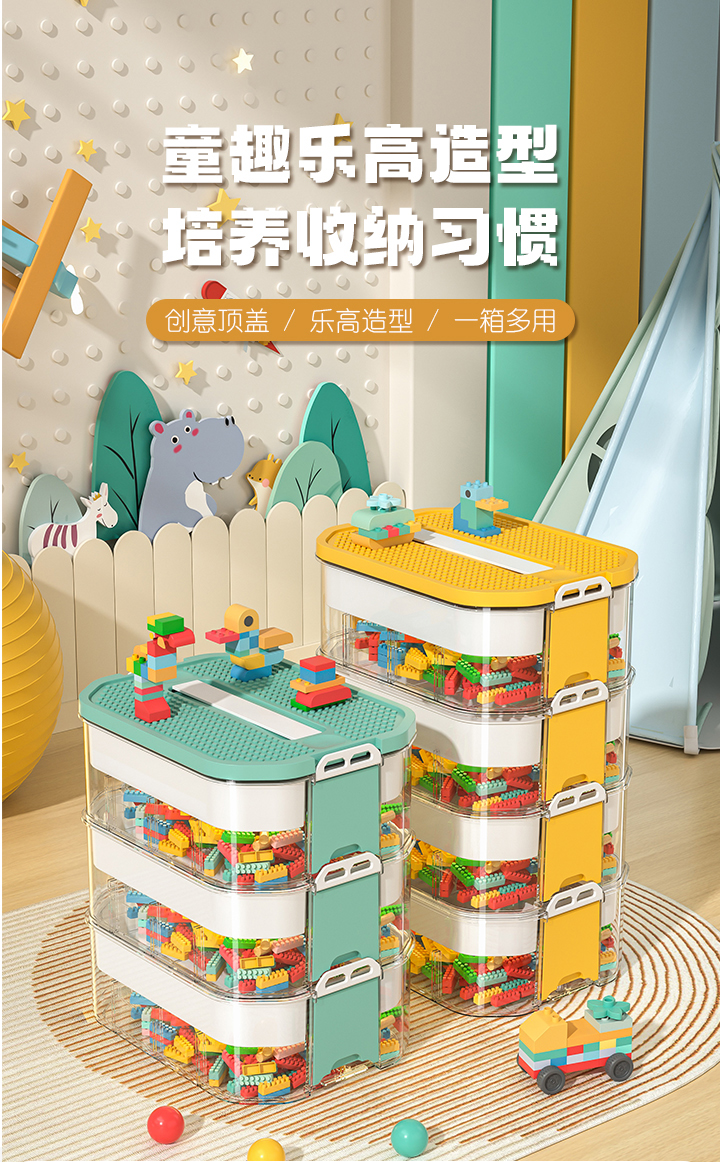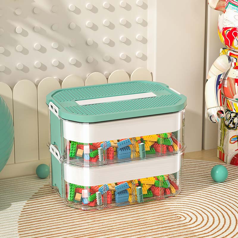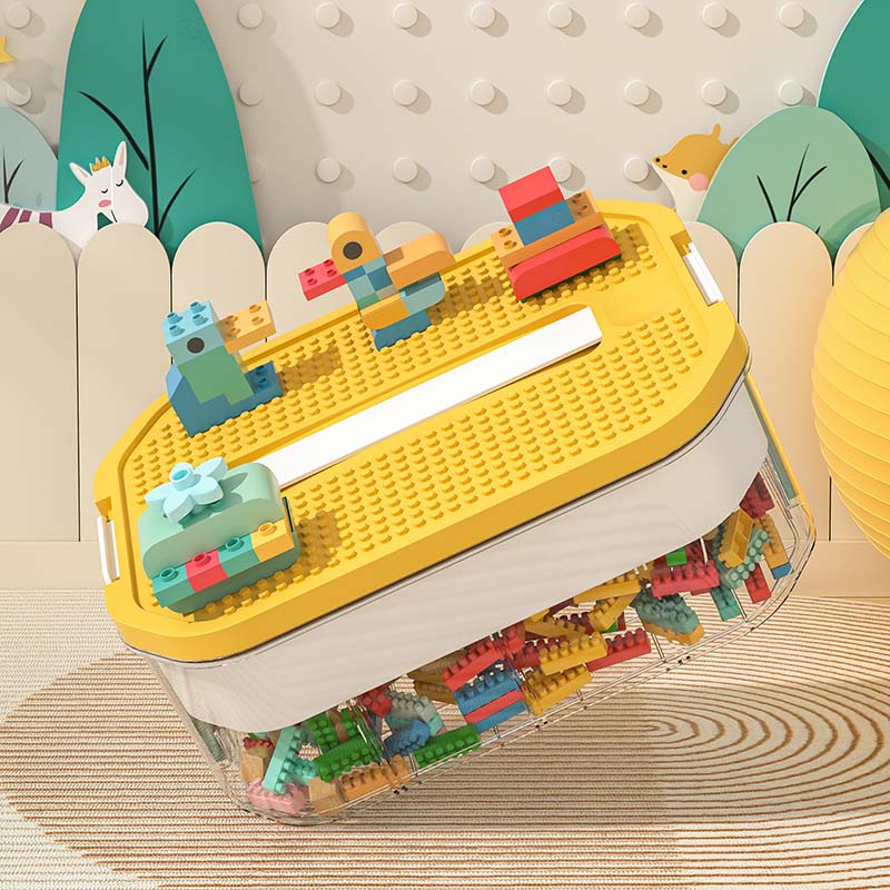 Building block storage box with child-friendly Lego design to help develop storage habits. Features a creative top cover / Lego design / multi-purpose in one box.