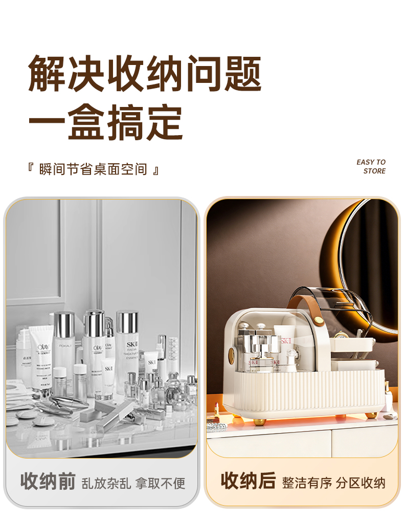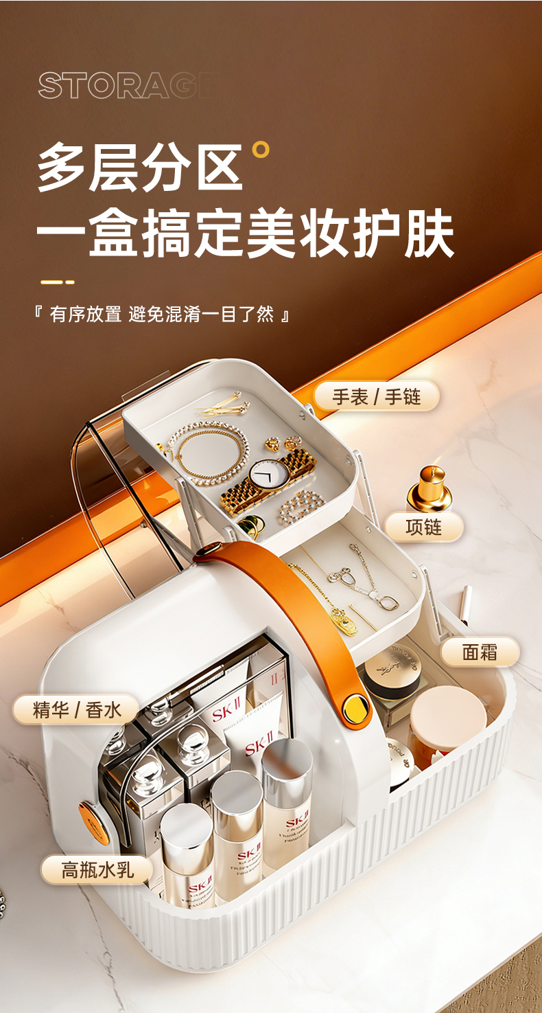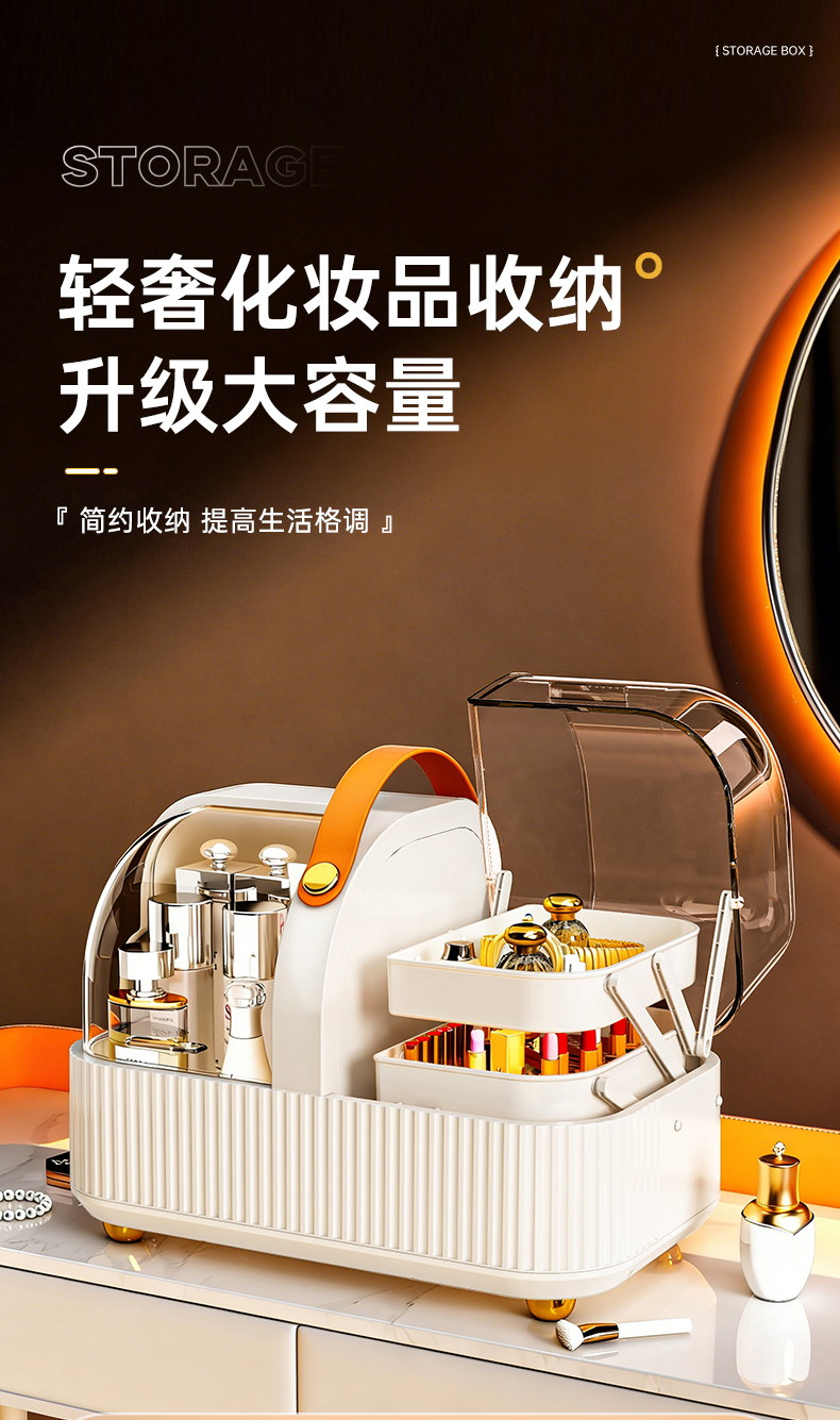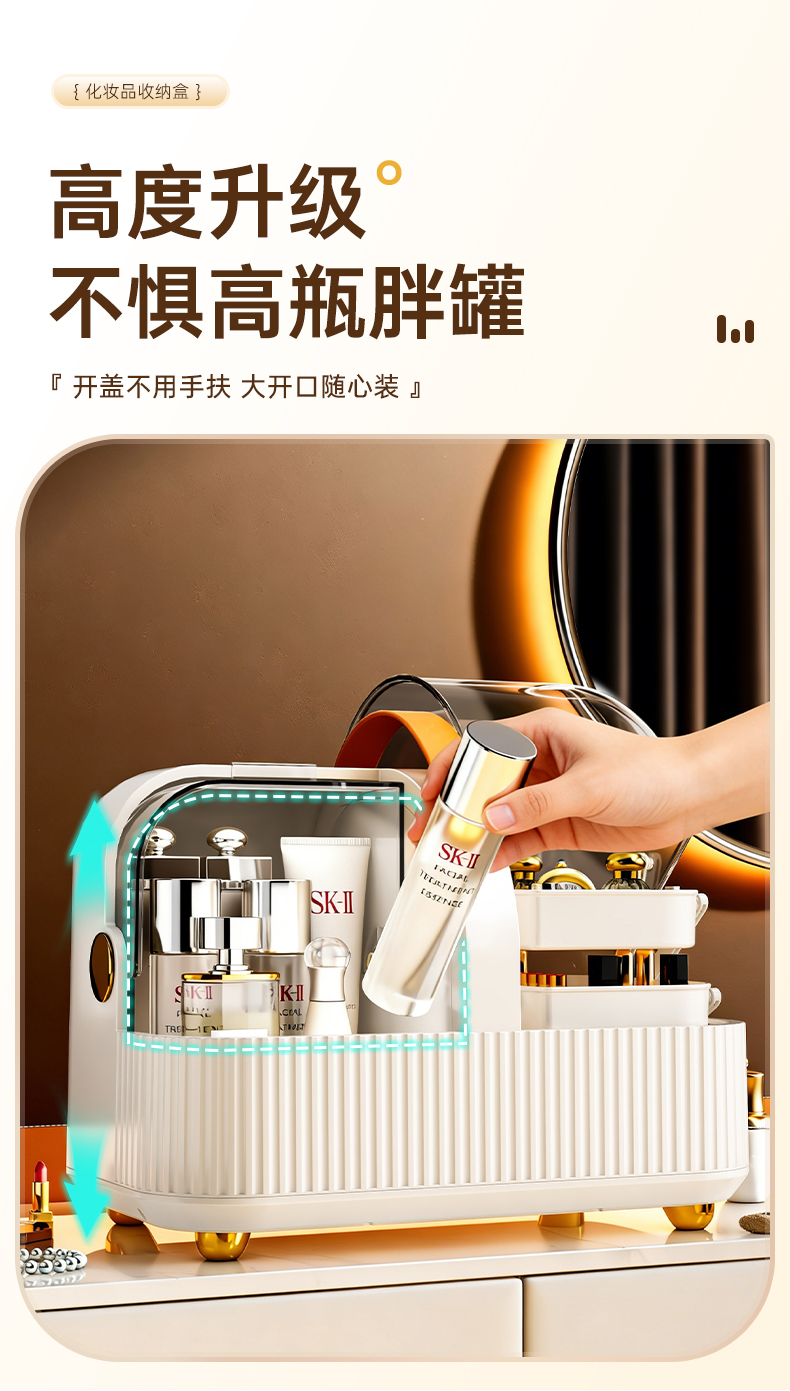 Luxury-simplified cosmetic storage upgrade – Large capacity – Simple organization to elevate your lifestyle. Six highlights: Transparent visibility, large storage capacity, diverse storage options, selected materials, layered storage, strong load-bearing capacity. Solve the storage problem with just one box, instantly saving space on your desk.