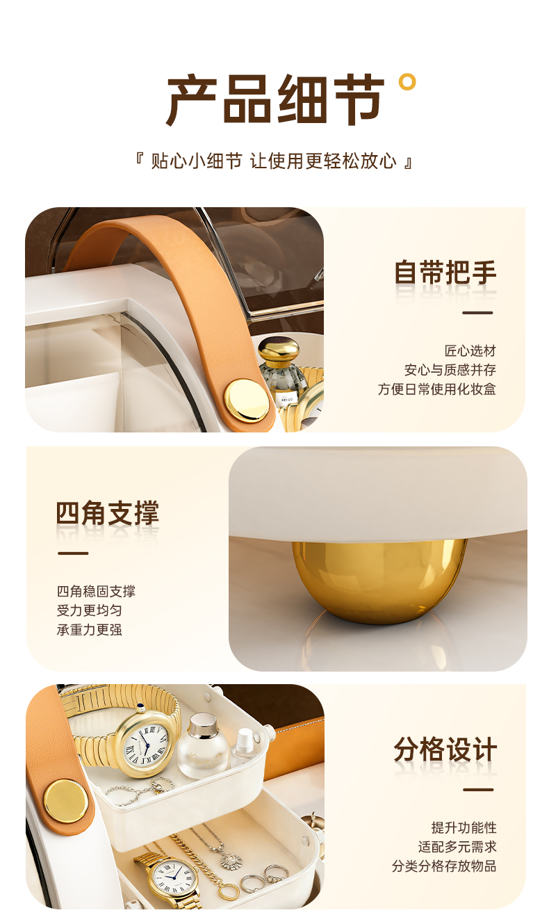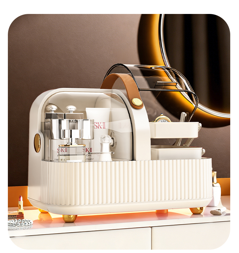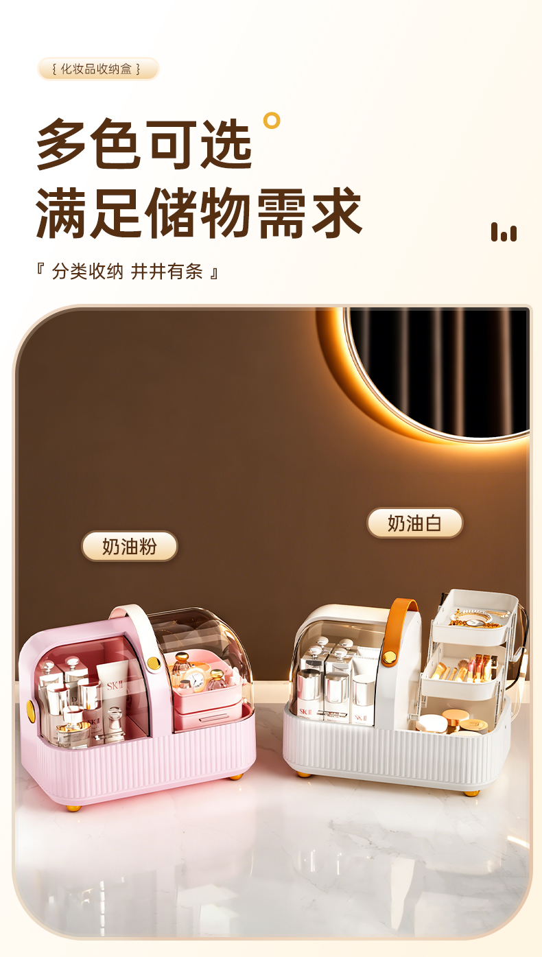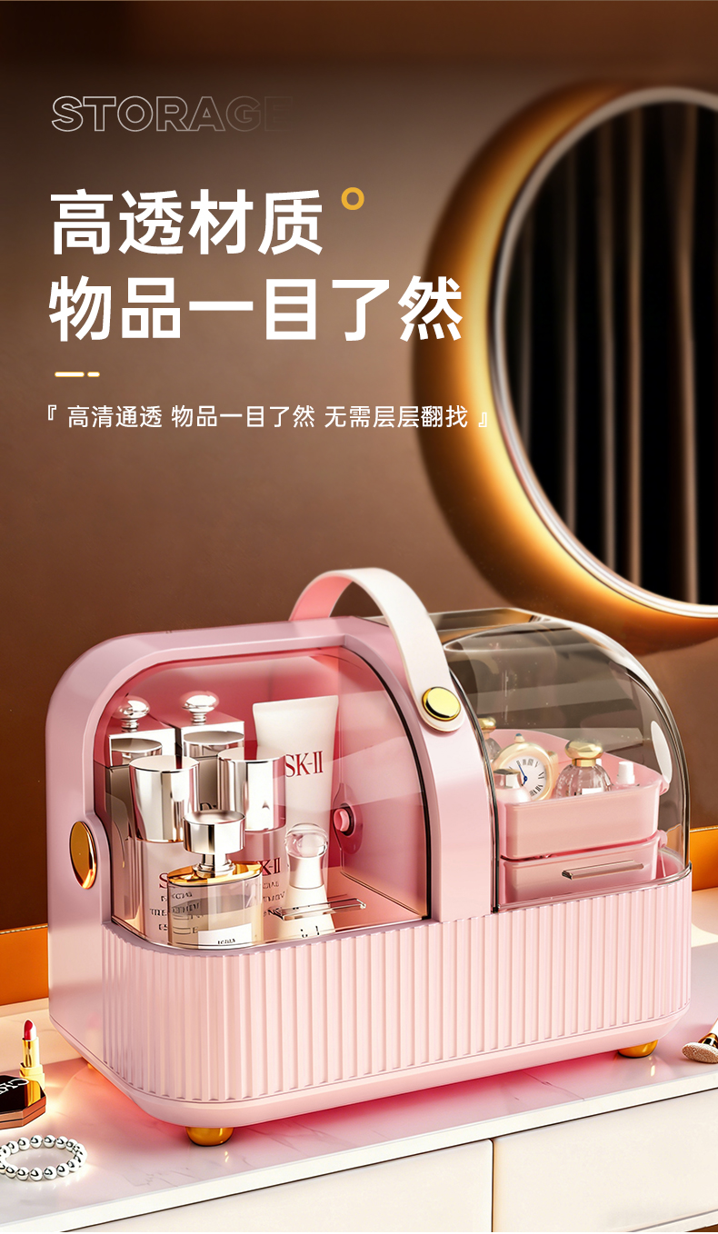 Luxury-simplified cosmetic storage upgrade – Large capacity – Simple organization to elevate your lifestyle. Six highlights: Transparent visibility, large storage capacity, diverse storage options, selected materials, layered storage, strong load-bearing capacity. Solve the storage problem with just one box, instantly saving space on your desk.