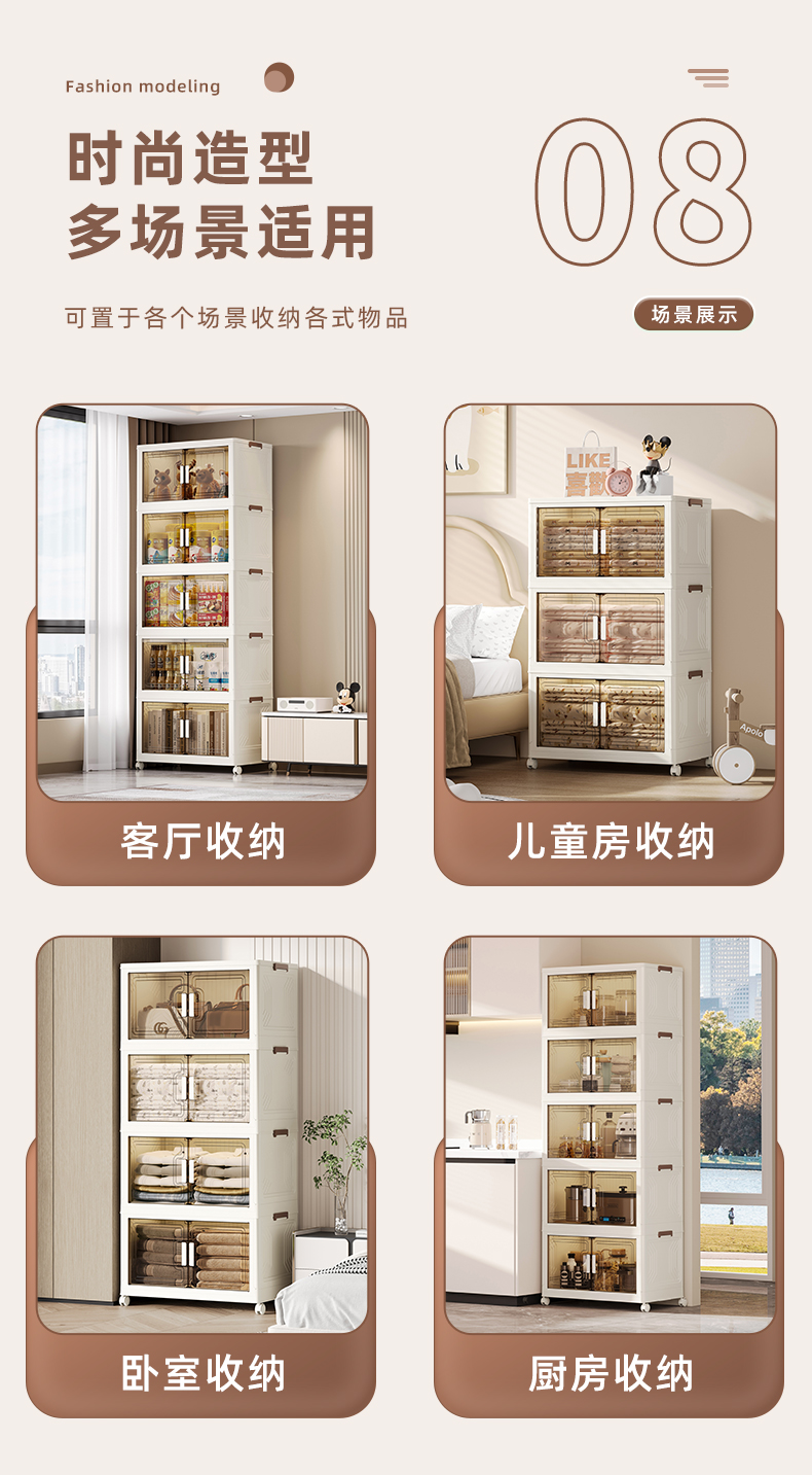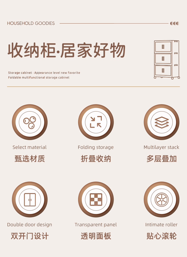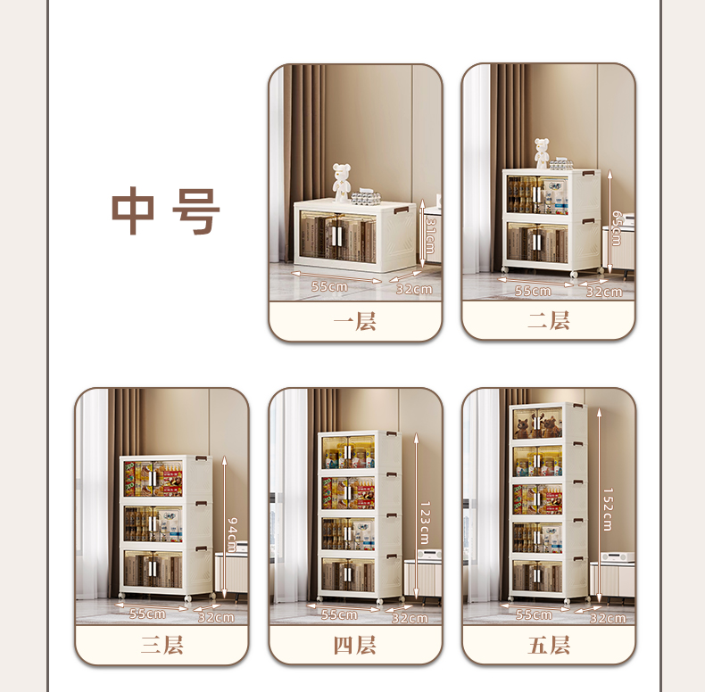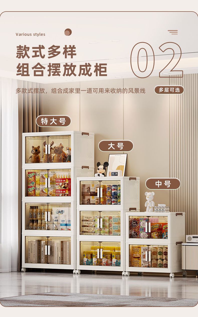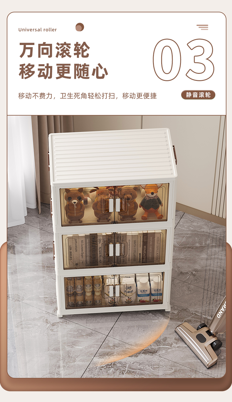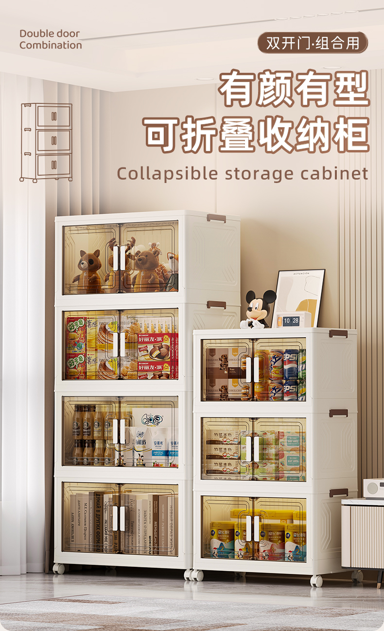 The double-door storage cabinet is both stylish and functional. It is a foldable storage cabinet. It features selected materials, folding storage, multi-layer stacking, double-door design, transparent panel, and thoughtful rollers.