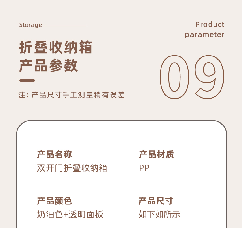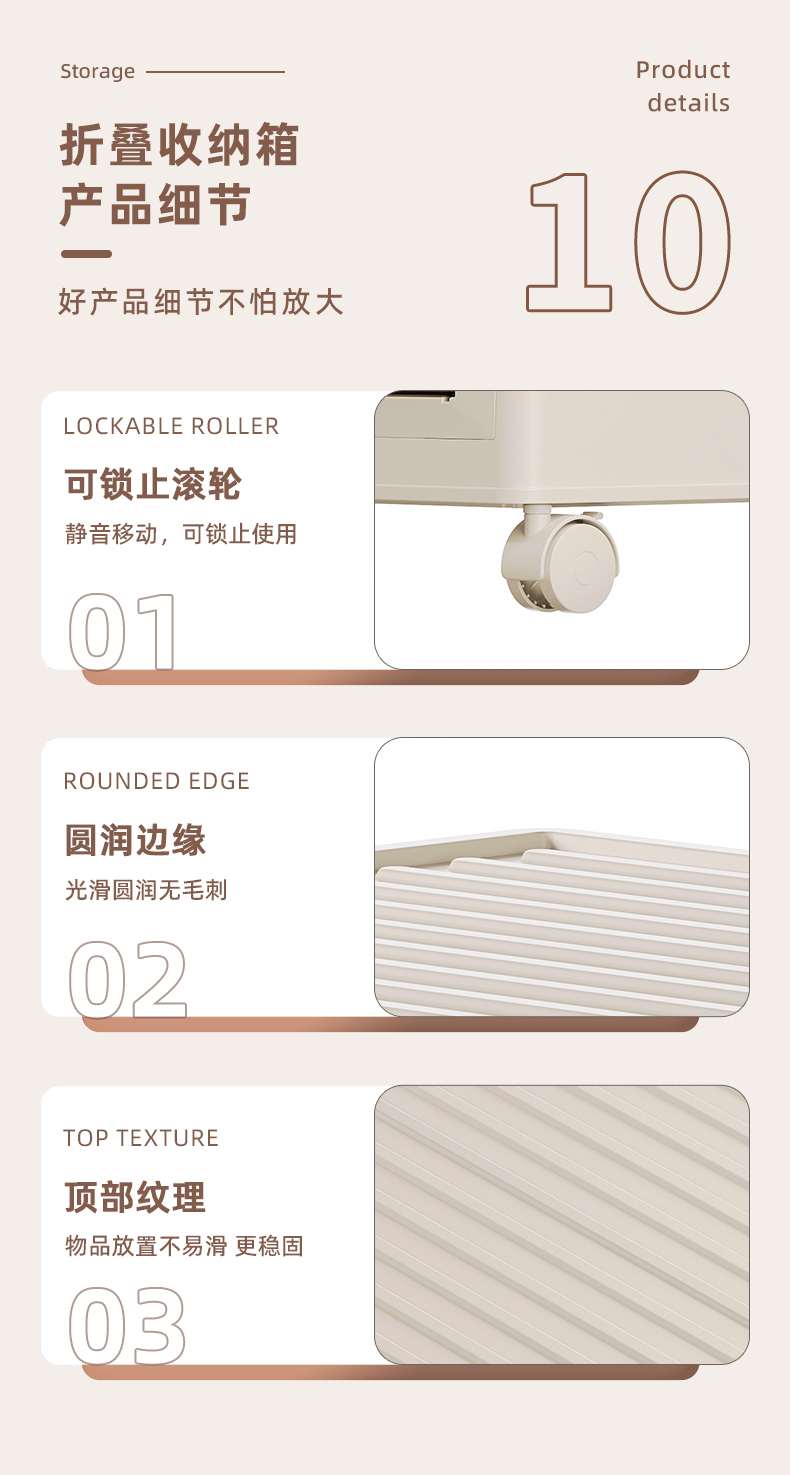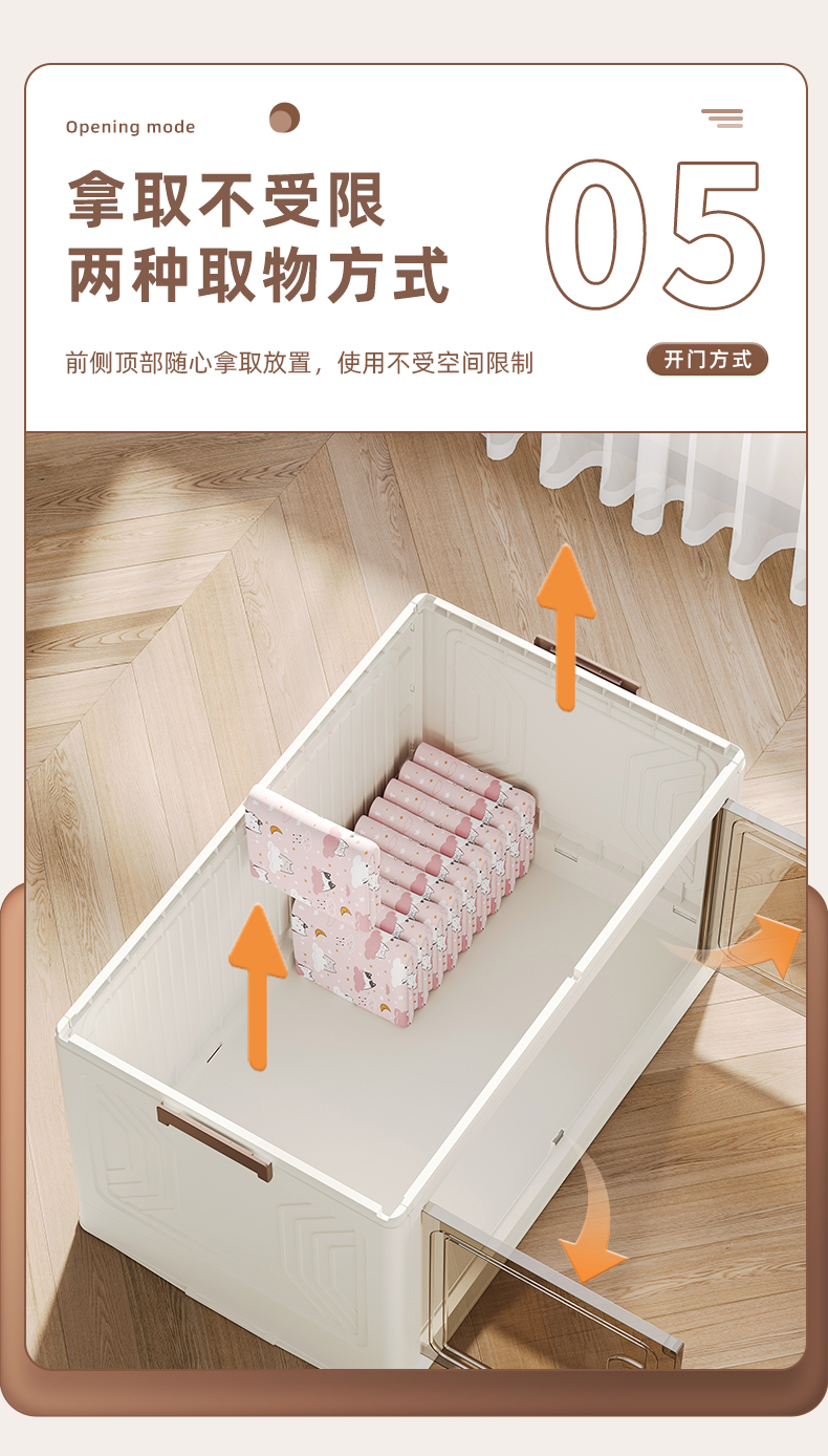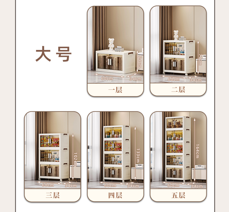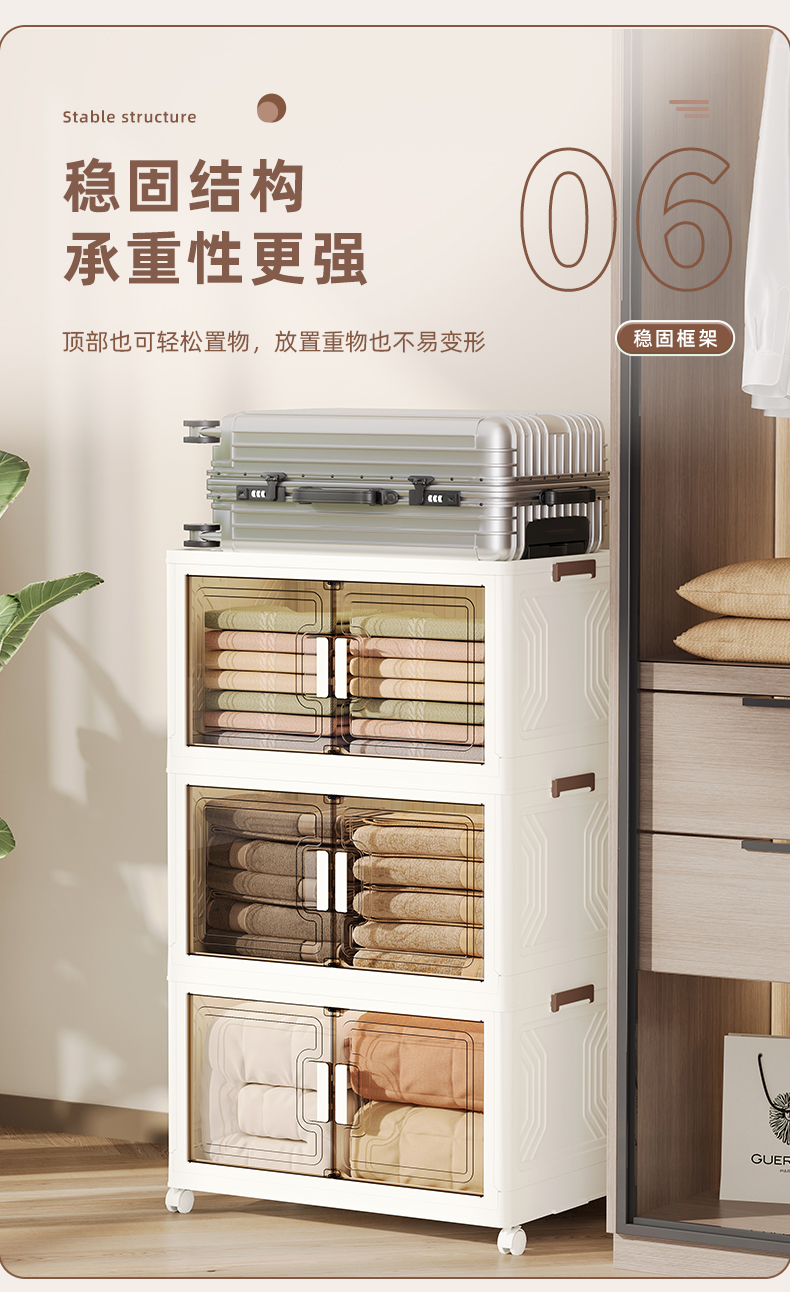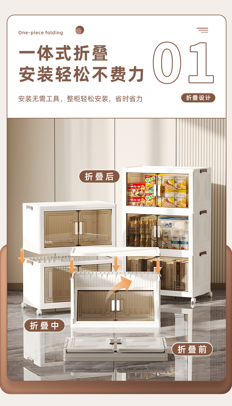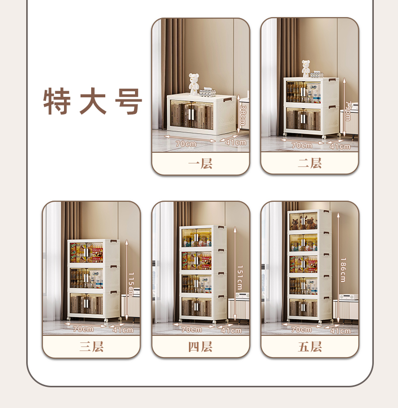 The double-door storage cabinet is both stylish and functional. It is a foldable storage cabinet. It features selected materials, folding storage, multi-layer stacking, double-door design, transparent panel, and thoughtful rollers.