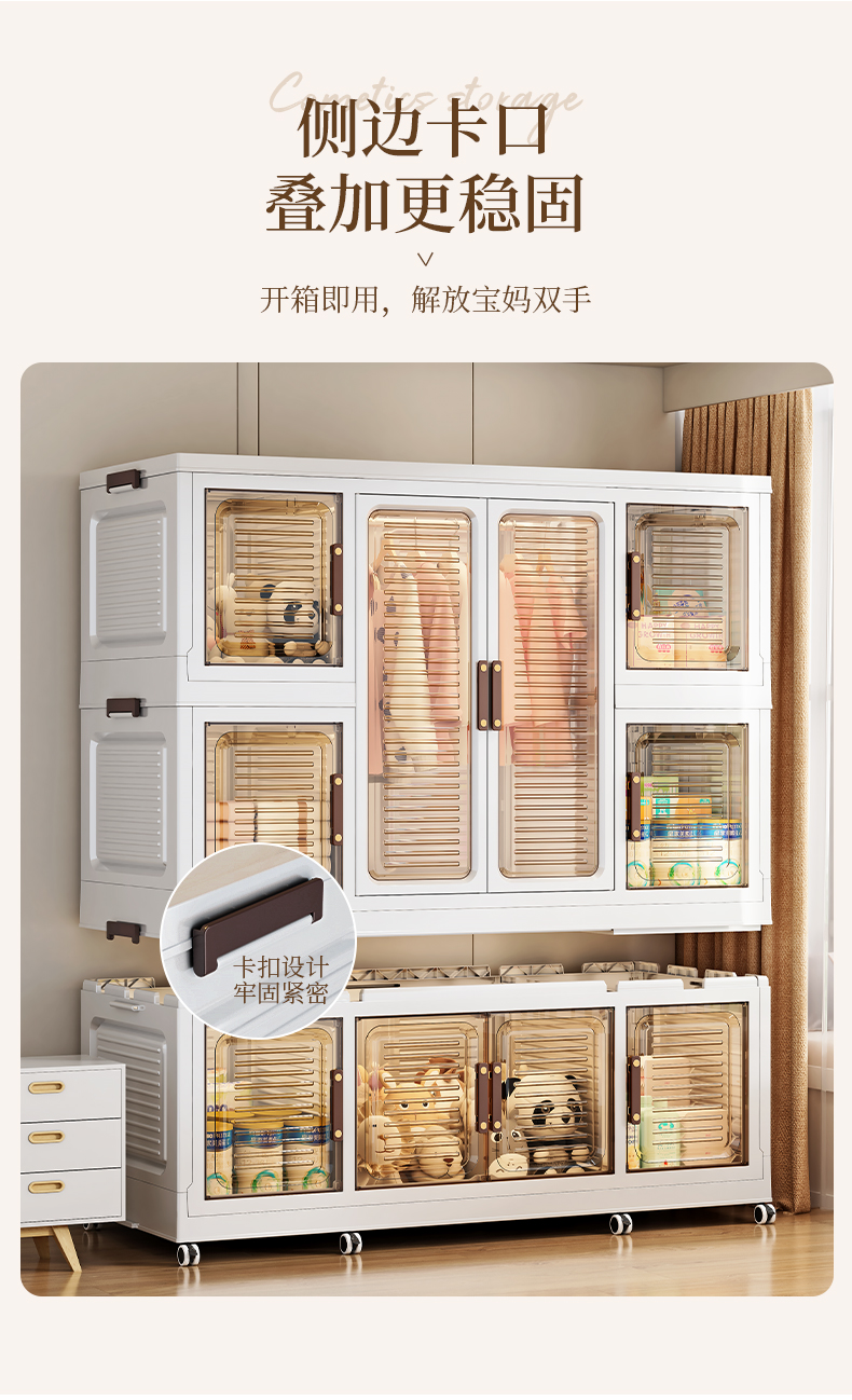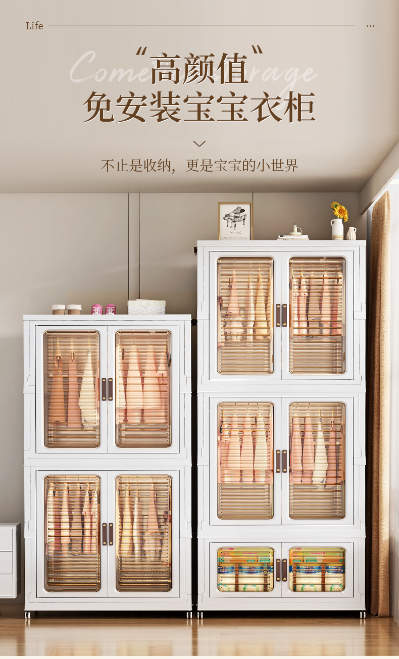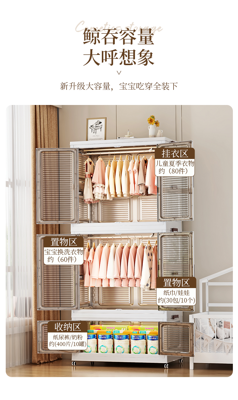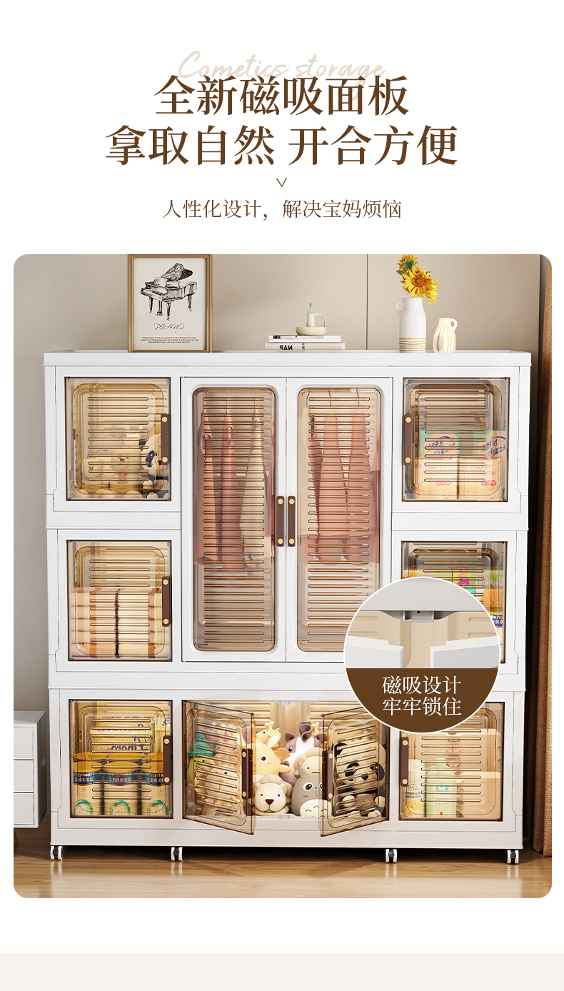 High-quality appearance level free-standing baby wardrobe, not only for storage, but also a little world for your baby. It offers you a different experience. Zone storage, no more chaos: larger capacity, waterproof and dust-proof, magnetic opening and closing, healthy materials.