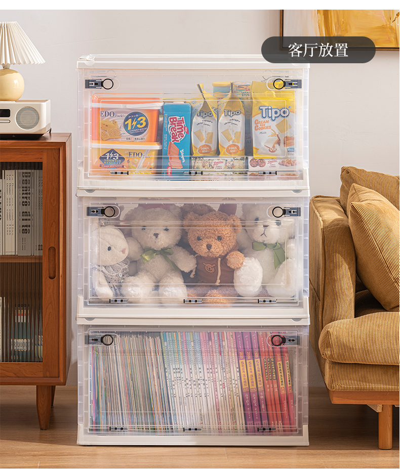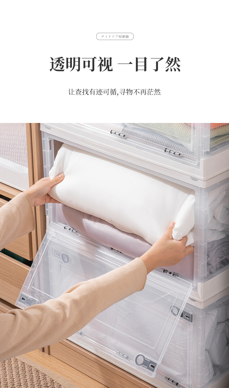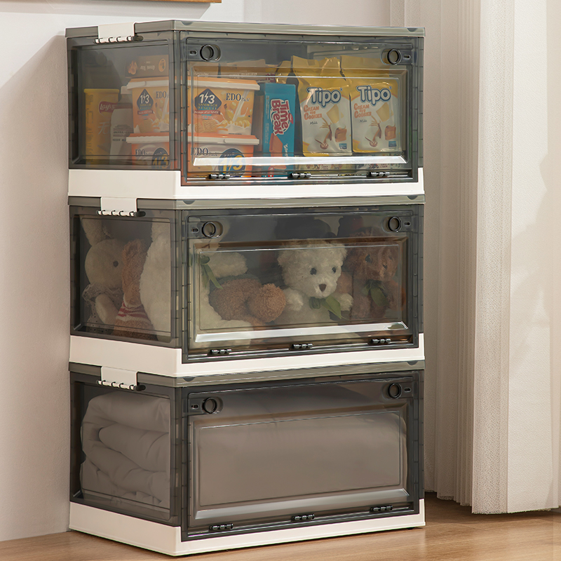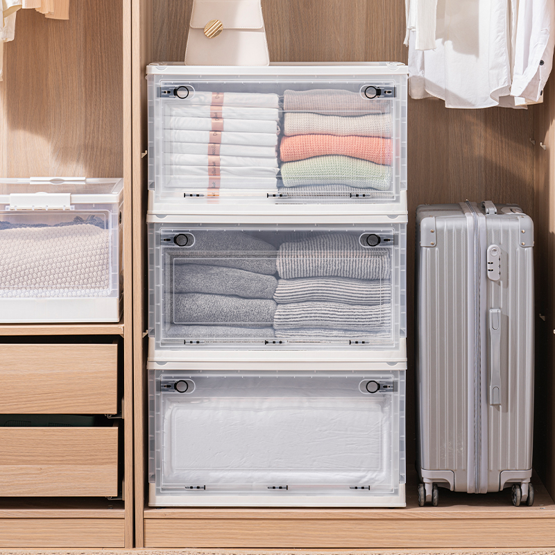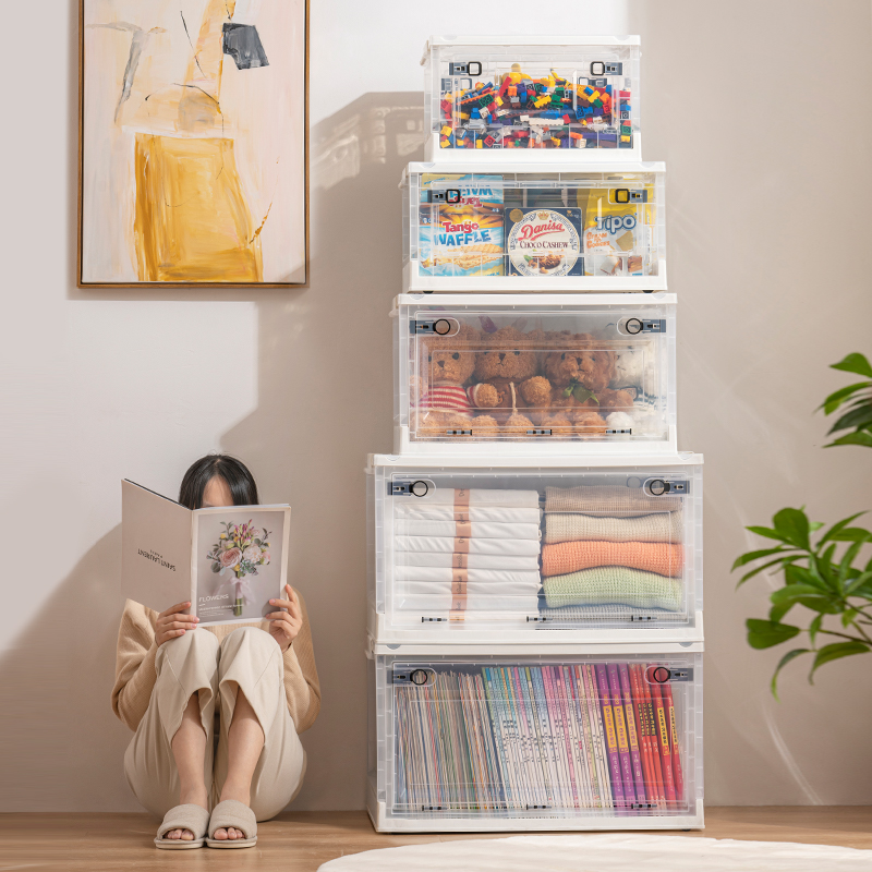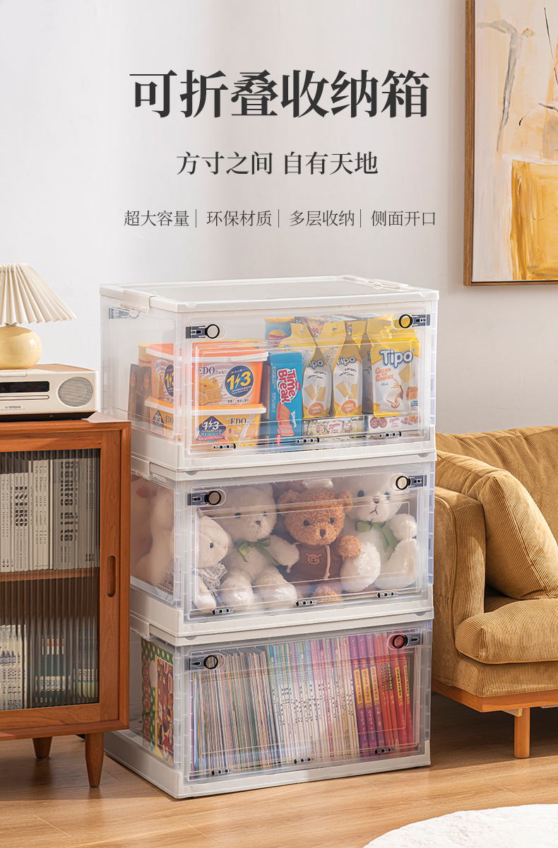 Transparent folding box has large capacity, is made of eco-friendly material, has multi-layer storage, and has an opening on the side. It is a new creation for a quality lifestyle, a new choice for home living.